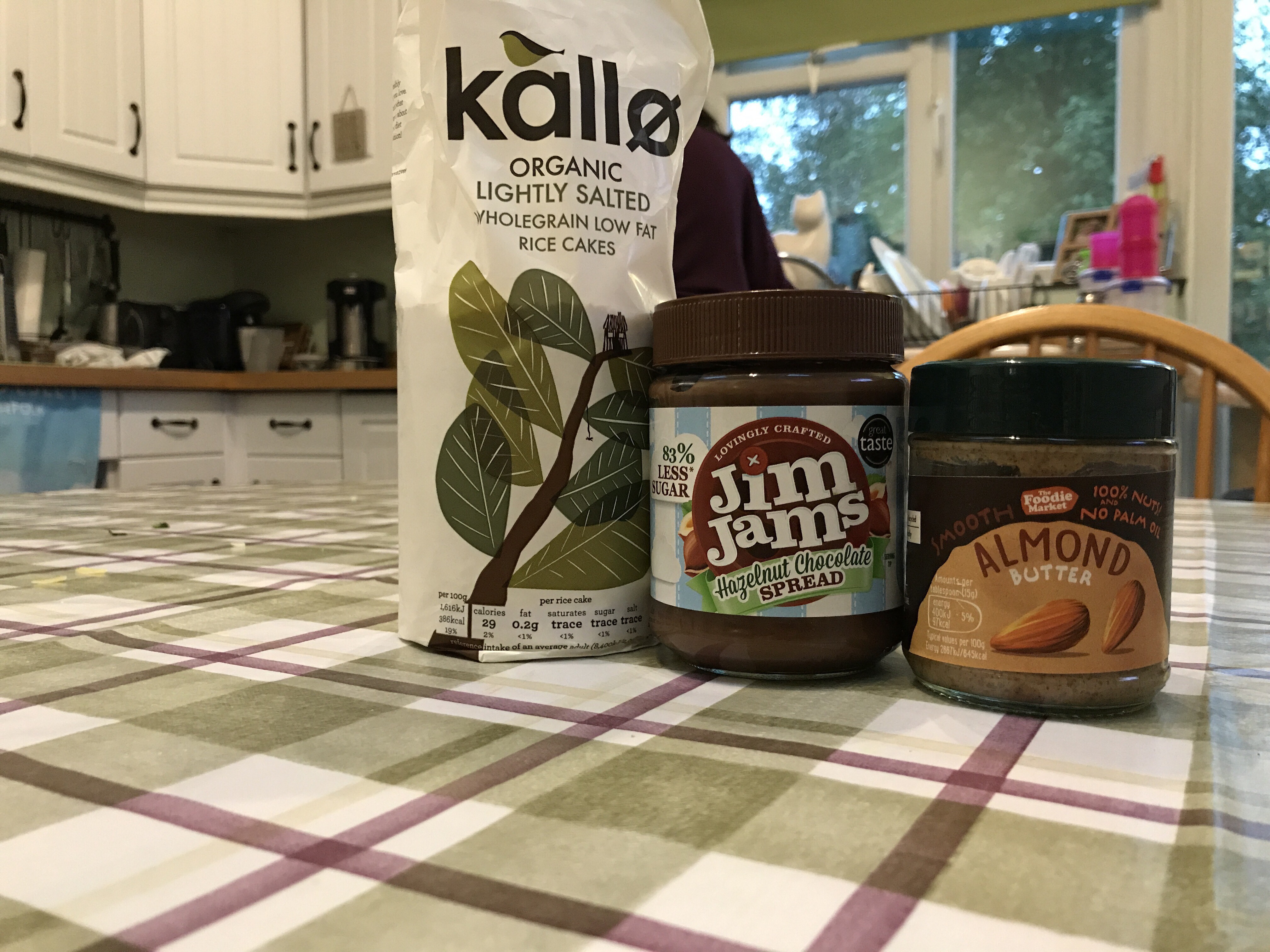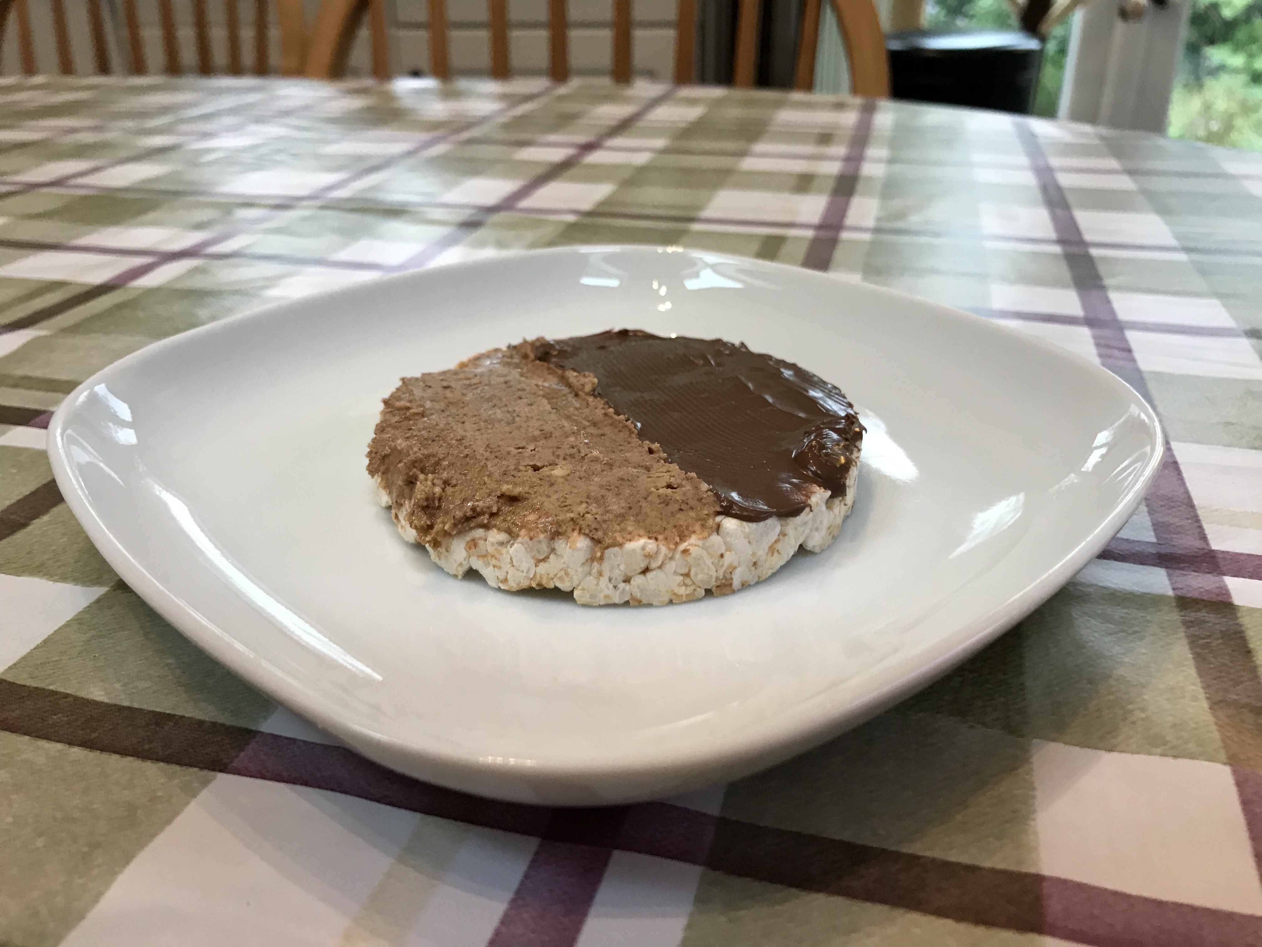 Hi, tonight for pudding I ate an organic whole grain rice cake with Jim Jams chocolate spread that I talked in my other blog on half and smooth almond butter which has no palm oil and all in on the other half.
